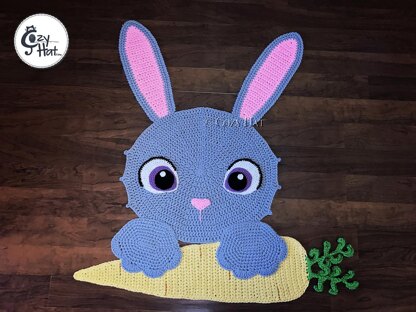 GAUGE: Work with hook 9 mm - M/N and 3 strands of yarn held together. 8 dc X 4 rows = 4” X 4” (10 X 10 cm) Size: Approximately 50” (127 cm) in height, from the top of the ears down to the bottom of the carrot. The width of the rug is approx 49” (124.5cm).