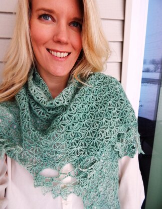 Bellamy is a romantic and airy shawl perfect for the transition from late winter to early spring. The unique lace points add a feminine grace to the classic triangle. The shawl is worked top-down from the shoulders with a seamless edging of shell and mesh points worked one at a time along the lower edge.