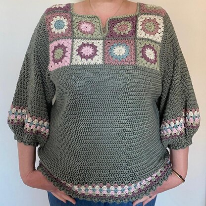 This pattern gives instructions to make with 2 granny square flower options, and either 1/2 or 3/4 length sleeves.