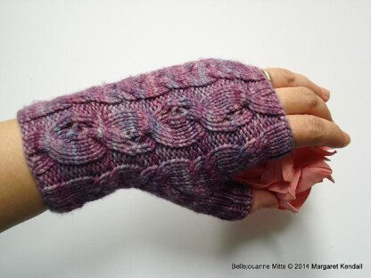 The Bellejouanne Mitts feature alternating cables and are worked from the bottom up and in-the-round with a gusseted thumb.