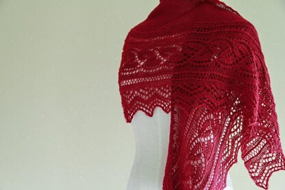 The Bellflower shawl is based off of the Kikyou flower found in Japan. This is a graceful and elegant shawl, with an intricate lace border and stockinette stitch body. You knit the lace border first, then pick up stitches through the slip stitches on the straight edge. The pattern includes both written instructions and a chart. The stitch count changes every row. This can be a challenging shawl to knit due to the bellflower motif but the end result is sure to be reward enough! When binding off, you can opt in to do the picot bind off, or bind off the shawl loosely. Remember, stockinette stitch rolls up so don't be afraid to be aggressive on blocking the body.