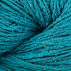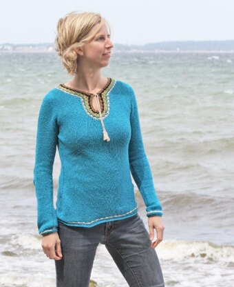 The shoulders are shaped by short rows and the keyhole shape at the front neckline is held together by a tasseled twisted cord.