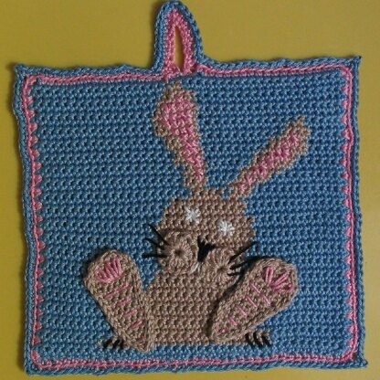 This is an original pattern for a colourful crocheted double thickness potholder with Benjamin Bunny on the front. The reverse is plain pink, and both thicknesses are joined by a double row of crochet in pink and blue.
