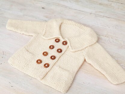 Sizes: Newborn, 3 months, 6 months, 9 months, 12 months, 18 months To fit chests of: 35 - 40 - 45 - 50 - 53 - 55 cm or about 14 - 16 - 18 - 20 - 21 - 22 inches Length: 22 - 25 - 28 - 32 - 35 - 37 cm or 9 - 10 - 11 - 12.5 - 13.75 - 14.5 inches Materials: Sublime Baby Cashmere Merino Silk 4 Ply (170 m to 50 g) 3 - 4 - 5 - 5 - 6 - 7 balls Knitting Needles: 3.25 mm ( US 3) and 2 DPN's in 3 mm (US 2.5) 2 stitch holders darning needle removable stitch markers 8 buttons 12 mm or 16 mm
