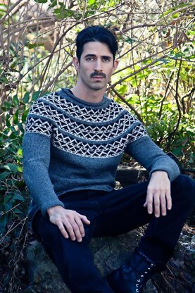 A unisex sweater, knit in the round from the hem up. The body is cast on circular needles and worked up to the armholes. This is then set aside and the sleeves are worked from the cuff up to the armholes. The pieces are then joined in the round and the stranded colorwork yoke is shaped with concentric decreases to the neck.