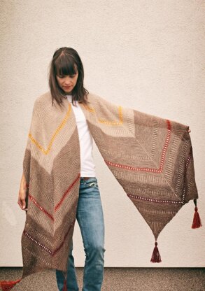 BerBer Wrap is a cosy, fluffy, easy-to-wear big shawl, worked in fingerging weight yarn on bigger needles, so it is airy and it flies off the needles quickly.