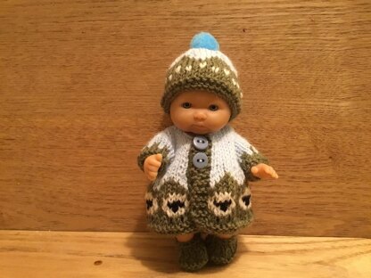 Instructions for a coat with sheep design, matching hat, panties and shoes. Uses 2 x 6mm buttons and a purchased pompom.