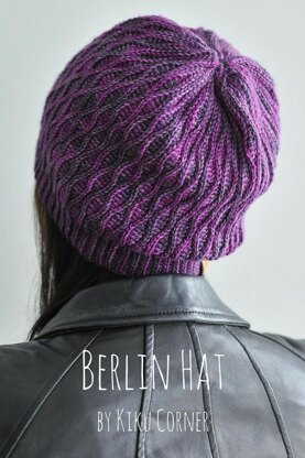 This hat is named after the beautiful but gritty city Berlin, which we used to visit every summer as children. The Berlin Hat pattern works best in a tonal-dyed yarn, such as Mineville Wool Project DK, Sweet Paprika Designs Minuet, or Blue Brick Escarpment DK. The pattern photo on the front page uses one skein of Blue Brick Escarpment DK in Aster.
