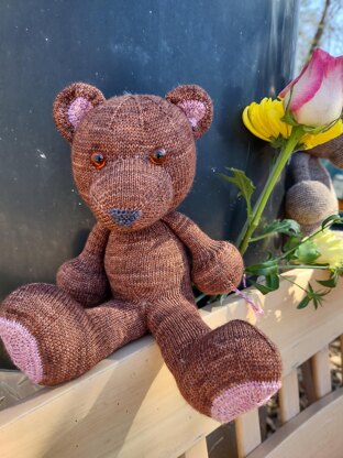 Bernadette Bear is knit in mostly one piece, with the arms, muzzle, ears, and tail being sewn on after completing of the legs body and head. She sits approximately 9 inches tall. There are video instructions for the tricky bits. I am always available if you have any questions.
