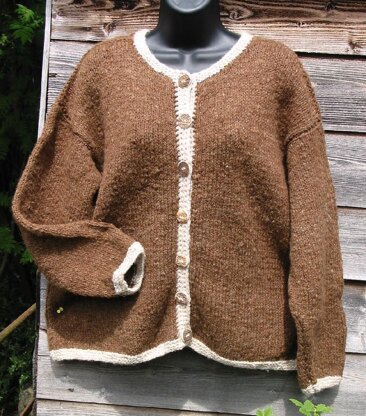 Classic style knitted jacket with contrast edging. length 24 ins. 4 sizes given 38 to 44 ins chest. 600gm main colour, 100gm contrast colour. 1 pair 5mm needles.