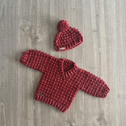 BERRI CROCHET BABY, TODDLER & CHILD SWEATER & HAT SET PATTERN PDF - A cozy textured baby and child pullover v-neck jumper available in 7 sizes from 0-3 Months to 10 Years. This is made seamless all in one from bottom up so no sewing of seams. Hat in 5 sizes 12' - 20" made in the round top down. Unisex | Gender Neutral - Boy or Girl.