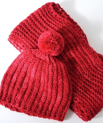 A curvy shape and stretchy rib make this cowl perfect for circling around your neck once or twice. Pom topped hat is just a bit slouchy and trimmed with a matching puff-stitch border.