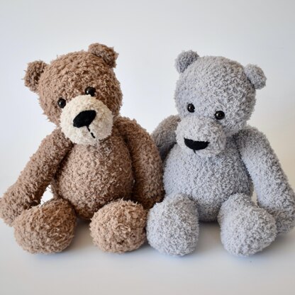 This teddy bear is knitted in a snuggly fleecy yarn to make it extra cuddly! Designed by Amanda Berry @fluffandfuzz, the bear is knitted in boucle DK yarns on single pointed needles (not in the round). Both grey and brown bears pictured follow the same pattern, just in different colours. For confident beginners and above, techniques used include casting on and off, knits, purls, kfb increase and k2tog decrease, and seaming to finish
