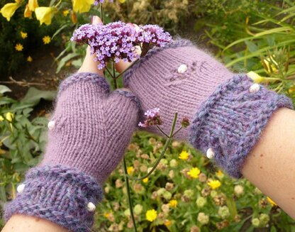 A quick lacy beaded fingerless mitt knit from the bottom up with a thumb gusset.