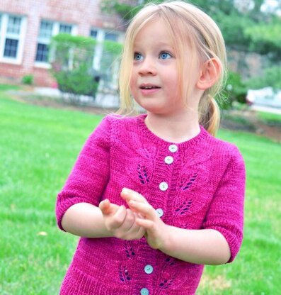 Berry Season is a darling cardigan for girls. Knit from the bottom up starting with a tubular cast-on and deep ribbing, the cardigan features a twin leaf lace motif down the center back and on either side of the button band. Faux side seams add just a touch of structure.