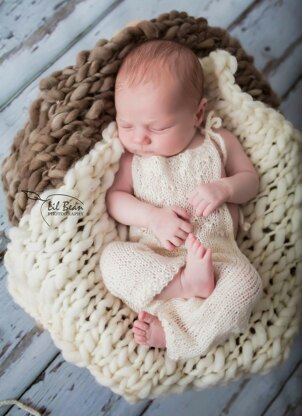 This is a newborn photo prop pattern for 'Bethany', which is a delicate hand knit Overalls with fine stitch details on the bib. The matching Bonnet completes the set! This makes a beautiful addition to your newborn baby's photo session. It's also a great gift for baby showers!