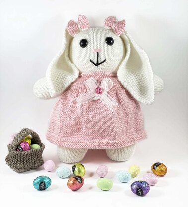 Betsy bunny Easter rabbit knitting pattern. Cute knitted baby bunny rabbit pattern comes complete with the pattern for her dress which is removable and her basket for collecting all those Easter eggs! The patterns are knit flat and seamed and are very easy to follow with clear instructions and photos.