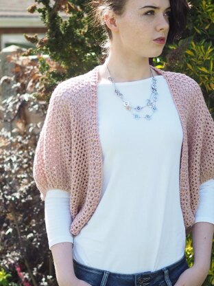 The betsy shrug is a loose fitting shrug or bolero with size instructions for small, medium and large. It is made in a dk weight yarn in a simple 'V' stitch pattern. It is worked in the round from cuff to centre back and then both sleeves are joined together with a cute 'kiss stitch' detail. The pattern works up quite quickly and this easy to wear shrug is a versatile day-to-night item. Either dress down with jeans and a simple white tee, or glam it up over a cute black evening dress - made in a sparkly yarn it would look fabulous!