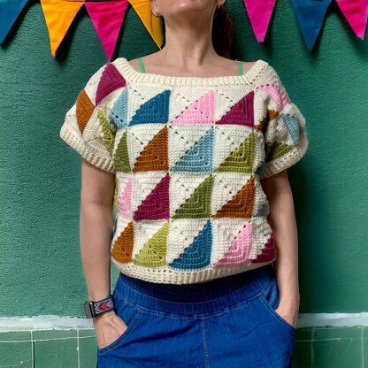 This is a great pattern to give a try. This crochet tee is colourful and unique and. It's an intermediate level pattern. You can crochet it in any size or color combination. You can easily adjust the pattern to your own preferences. The top is made out of 60 granny squares. Feel free to use the yarn and matching crochet hook of your choice to make the sweater. The result will be bigger or smaller keeping the same proportion. Materials You can use any combination of colors. I used 3 balls of main color and around 2 balls of contrasting colors / scrap yarn.