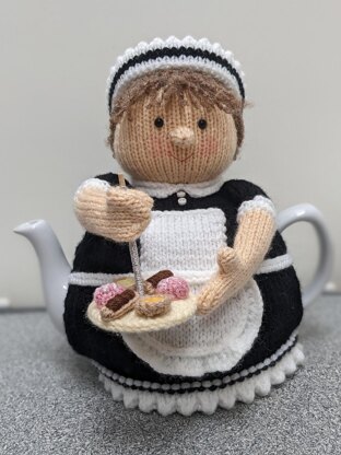 The main body of the tea cosy is knitted using 2 strands of DK yarn held together. I used Bouclé for the hair but any DK can be used. I used 6mm eyes, 6mm buttons, a bamboo skewer and card for the cake stand. Clear adhesive.