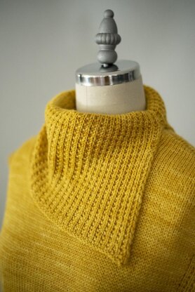 This vest, featuring a slanted cut-out on one side and wide long turtleneck collar with a slit, is a study in balanced asymmetry. The body of the vest is worked in Stockinette Stitch with Garter Rib borders and hem. The collar is also worked in Garter Rib.