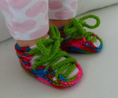With these funky lace up sandals, the sandals are knitted in garter stitch and the laces are knitted using double-pointed needles.