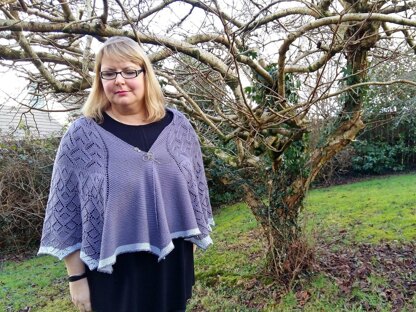 Feminine and graceful, this cape is worked from the top down combining several lace patterns for the main semi-circle with garter stitch front sections. For a shorter cape, work fewer repeats of Chart D.