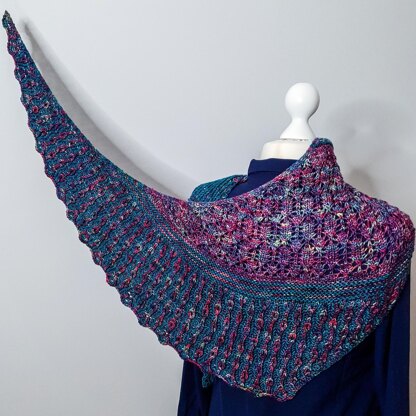 Introducing the Bias Bloom shawl: an asymmetric triangle shawl shaped on the bias, creating a beautifully elongated crescent that drapes gracefully around your shoulders. Stylish and endlessly wearable, this shawl is a must-knit for any season! The knitting process is just as delightful as the finished piece - never monotonous, always engaging. From geometrical lacework to garter stripes and the soothing rhythm of brioche stitches, each section of this shawl will captivate and challenge you!