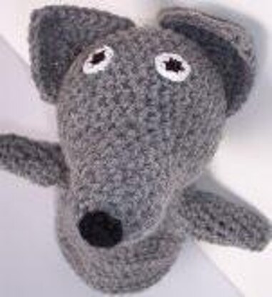 He is made from a lovely gray yarn, with a delightfully fluffy tail. He has a couple menacing teeth sticking out from his mouth. Inside, I have made the hole for controlling the head roomy enough for three fingers.