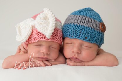 Quick and easy hats knitted with worsted weight yarn and large size needles. You can make each hat in less then an hour. Perfect for a baby shower gift, hospital baby hats, photo props, or just a cute hat to make for your little one, in any color you choose!