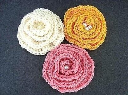 This is a listing for a CROCHET PATTERN, so you can make big elegant flowers to use as APPLIQUES, OR AS BROOCHES! Finished, it measures about 4 inches across! What a lovely addition to hair bands, or shawls, or even a blazer or a coat! This is a very easy flower to make. I have simplified it so that even BEGINNERS can complete this design. It is very elegant, and can be dressed up with different beads for many different looks. It would also be lovely in any color! This flower can be made up in less than 1/2 hour, and that includes sewing the beads on, and if desired a pinback to the back of the flower.