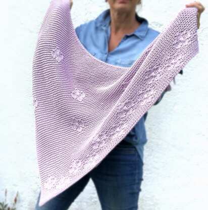 Garter stitch and a simple triangle shape make this shawl a relaxed project, the flowers are easier to knit than you would expect and interrupt the boredom of plain rows.