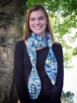 The Big Leaf Scarf is a series of leaves, knit end to end with super bulky yarn on large needles. The length is easily customizable; knit as many leaves as you wish! Gauge is not critical for this pattern.