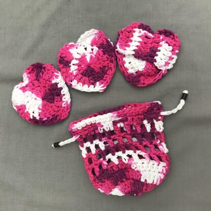 I used Lily Sugar ‘n Cream cotton yarn in the Love colourway. Totally appropriate, right? I was able to make a set of four plus the laundry bag for just under one 56.7g skein.