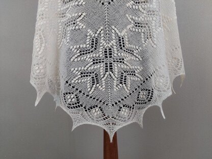 Pattern of shawl is charted and easy to follow. Shawl gets its shape by decreasing method – you start with bunch of a stitches (edge lace) and decrease stitches as instructed.