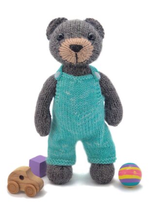 The teddy is knit from 100 g (at least 125 yds) of bulky weight yarn on size 9 (5.5 mm) needles, and the overalls are knit from 50 g of worsted weight yarn on size 7 (4.5 mm) needles. A contrasting yarn can be used on the face for a different look.