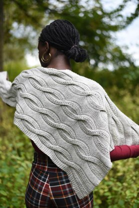 Big, fat, lush – and reversible!–cables run the whole length and width of this dramatic winter wrap providing texture for days and warmth to sink into when the cold winds blow. But don’t be fooled by its robust appearance; when knit in airy wool at a loose gauge and with a few eyelets thrown in, the fabric is light and drapes–never heavy. If rustic wool isn’t your style, try it in a silkier blend–the result is completely polished, going from boardroom to evening with elegant, streamlined smoothness. This project is a surprisingly quick knit for gifting or when a fresh winter accessory is needed.
