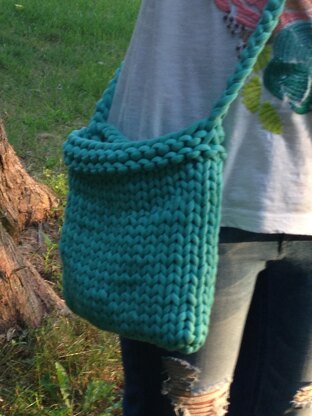 This is knit flat, seamed, and then a handle is made from crochet chains or knitted i-cord.