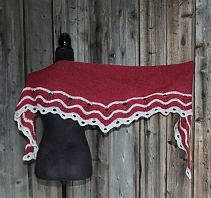 Bila-shawl is first knitted sideways to form a long shallow triangle. The border features modified traditional Crown of Glory pattern after picking up stitches from the lower edge of the triangle. The traditional Hap-shawl yarn overs form a smooth upper edge. There’s two options for the very edge, less holes, beige shawl or more holes, red shawl. The pattern has both written and charted instructions.