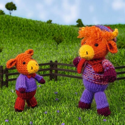 This adorable duo are all dressed up for a day out, with the proud father bull Billy taking calf Bertie on a walk around Woolly Farm. These toys uses stockinette, reverse stockinette and garter stitch to make a pair of textured knits. Designed by Amanda Berry @fluffandfuzz, the toys are knit in DK yarns on single pointed needles (not in the round). For confident beginners and above, other techniques used include casting on and off, knits, purls, increases and decreases, and seaming to finish. The bull is 19cm tall and calf 14cm tall.