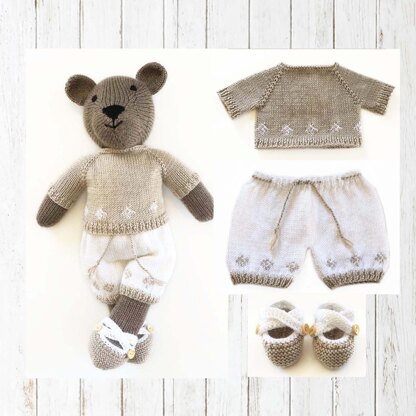 Billy, a cute 43cm (17 inch) teddy bear knitting pattern and he comes complete with his sweater, shorts and cute little shoes.