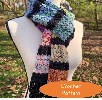 The Bimini Scarf is an easy scarf that shows off your 10-gram microskeins or scraps to their fullest! It uses a simple 4-row repeat and is great for the confident beginner as well as experienced crocheters!
