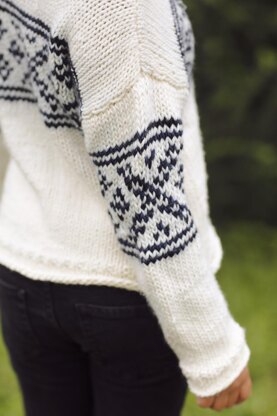 I wanted to design a cozy, warm pullover for winter that would be a modern take on traditional Scandinavian style. The pattern uses a thick, cushy yarn—to make it quick to knit—and one simple band of patterning for minimalist Norwegian style. I chose rolled edges for their casual look—a concealed bit of ribbing controls the roll. Dropped sleeves and a straight body add to the classic silhouette. The tracings of dark lines across the natural color reminded me of the trunk of a birch tree, hence the name. This is a great pattern to try colorwork for the first time or to whip up as a quick gift!