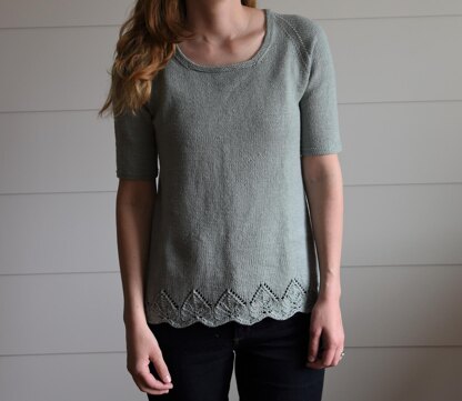 Birdsong is knit seamlessly with a combination of bottom-up and top-down construction methods. You begin at the hem and work up through the neck, provisionally casting on the upper sleeve stitches. The sleeves are knit from the top-down, and instructions are given for four sleeve lengths. Slight A-line shaping and a lovely, scalloped lace hem make for a beautiful and easy to wear garment. Knit in fingering weight yarn, it is recommended that a yarn with good drape is chosen to ensure a flattering garment. Sample pictured is worn with 1.5 inches / 4 cm of positive ease.