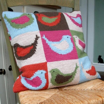 A folksy birdy motif is repeated in this colourful design on the front, while the same colours are playfully used in random stripes with decorative buttons for the reverse, allowing you to ring the changes as you fancy by simply turning the cushion around. This pattern includes comprehensive instructions for knitting with colour charts plus detailed instructions on how to make the cushion up.