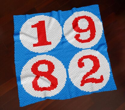 Year 1982 Crib Blanket created with the C2C crochet technique. The bold design features large red numerals inside crisp white circles on a vibrant blue background, creating a striking retro style. Perfect as a personalised keepsake for celebrating a birth year, milestone birthday, or special anniversary.