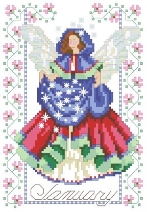 By Barbara Baatz Hillman. January birthdays are celebrated with this Fairy holding a bag full of snowflakes. The border is made up of lovely pink carnations, the flower of the month of January. A lovely way to celebrate someone born in January. One in a series of twelve faeries.