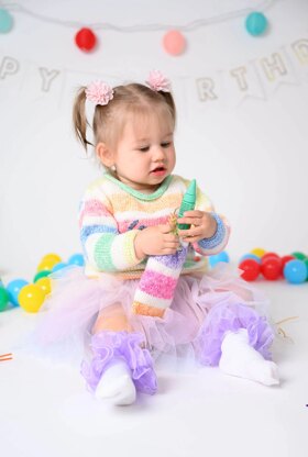 The knit Birthday Pullover will give a personal touch to babies first birthday. Ice Cream® yarn is soft and comes in a variety of playful, self-striping colorways that resemble little one’s favorite sweet treats. The yarn’s pastel shades and fun color combinations make it perfect for a cheerful birthday sweater.