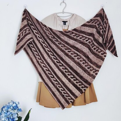 The Biscolata shawl combines the sweet essence of ‘biscotto’ (Italian for biscuit or cookie) with the creamy allure of ‘latte al cioccolato’ (Italian for milk chocolate). It alternates two colors to highlight two captivating stitch patterns weaved together: the graceful swirls of cables and the bold diamond texture.