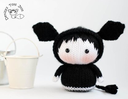 Black Angus Cow Doll named Lexi. Toy from the Tanoshi series. Toy related knit stitch. The finished Black Cow doll is approximately 4,33’’ ( 11 cm ) tall.
